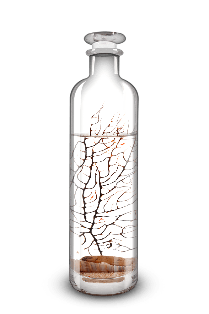 • Contiene ecosistema con 1 gorgonia inerte y ramificada, 4/6 camarones, gravas marinas, roca marina